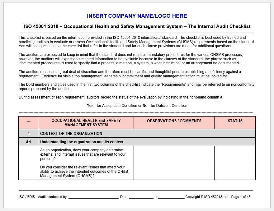 Price: $75 BUY NOW - OHSAS 18001:2007 to ISO 45001:2018 Gap Analysis Checklist